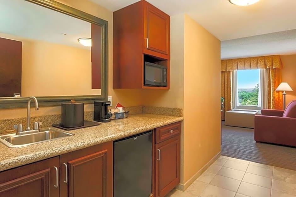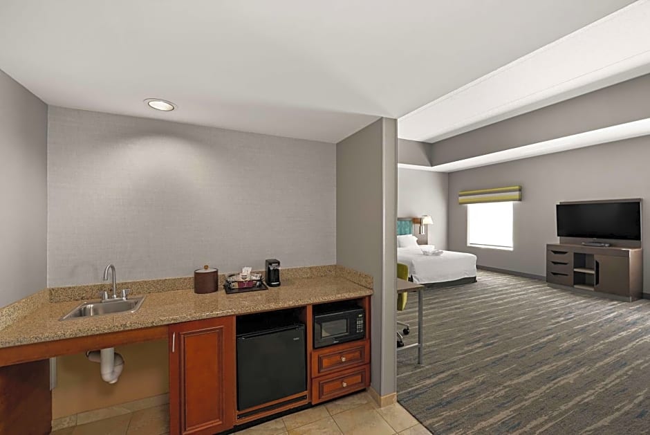 LCD HDTV, work desk, sofa bed, coffeemaker, free WiFi, whirlpool tub, refrigerator, microwave Experience relaxation and comfort in this spacious studio suite with a clean and fresh Hampton bed® and a whirlpool tub. Watch a movie on the LCD TV with premium HD channels or relax in the seating area, featuring a sofa bed which sleeps extra guests. This suite contains a large work desk and free WiFi to allow you to keep on top of work while on the road. The stylish bathroom features plush towels, a shower with a curved shower rod for added space, and a deep bathtub. The suite also boasts a coffeemaker, a microwave, a refrigerator and a sink area.